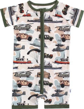 Salute military heroes in a print featuring a desert camo background & military vehicles. This short zipped romper is designed in buttery soft, magic stretch viscose- perfect to march from the sheets to the streets.