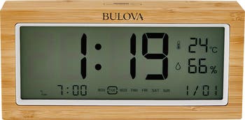 Solid natural wood case protected with a clear finish to enhance the genuine grain of the wood. Large LCD numbers are easy to read. Information center shows the Month, Date and Day of the week. The room temperature and relative humidity are shown digitally as well. The alarm time is also clearly shown. Unique “weekender” feature allows the alarm to be set for 5, 6 or 7 days to give the weekend off. The electronic beep alarm will ring steady up to 10 minutes for heavy sleepers plus a Snooze feature. Touch the top of the clock to activate the backlight display for nighttime viewing then shuts off. Uses (2) AA batteries (not included).