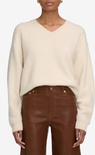 A fuzzy brushed finish amps up the sweater-weather appeal of a classic cashmere pullover knit with dropped shoulders and a V-neckline.