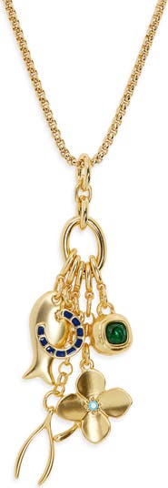 A cluster of lucky charms and an emerald-hued hammered bead bring symbolic shine to this goldtone pendant necklace designed to spark conversation.