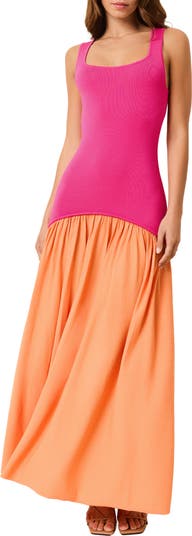 Fashioned with a low-dipped back, this figure-skimming dress is cut in a floor-grazing length and made in a two-tone design for eye-catching dimension.