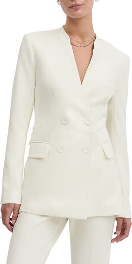A collarless design updates this double-breasted blazer creating a streamlined look that complements office and evening looks.