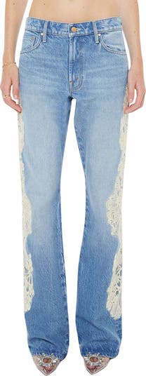 Floral lace traces the outseams of these nonstretch-denim straight-leg jeans that bring drama and romance to classically casual styles.