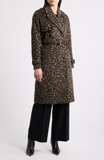 A bold leopard pattern adds classic character to this double-breasted coat cinched with a matching belt for added structure.