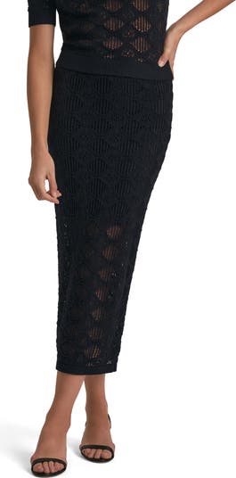 Airy patterned stitching brings warmth and breathable charm to this figure-skimming sweater-skirt knit in a longline silhouette and topped with a comfortable elastic waist.