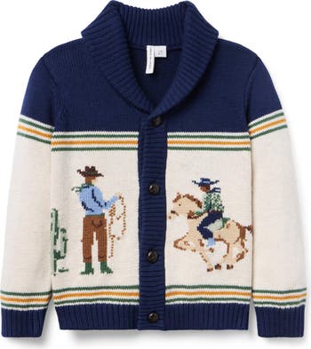 This western-inspired cardigan is a round-up of all our favorite details. Featuring an intarsia cowboy design, shawl collar, and ribbed details too.