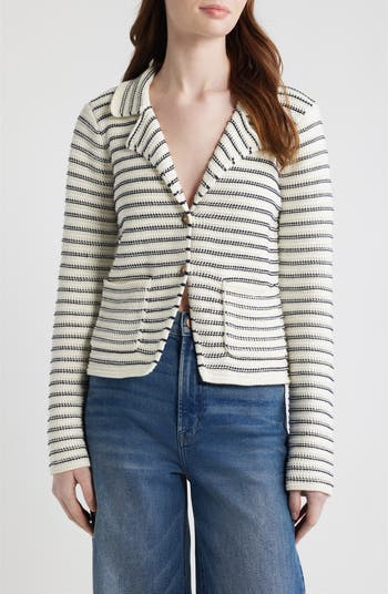 Marbled buttons enhance the tailored silhouette of this soft knit blazer stitched with lively stripes.