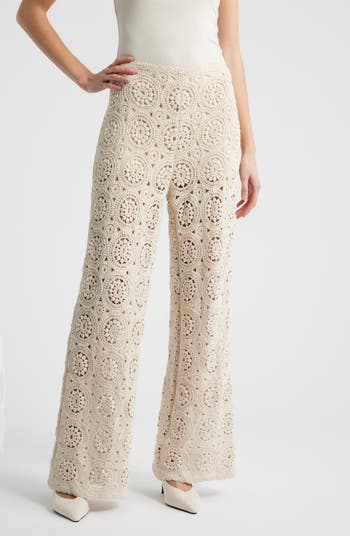 Flowy wide-leg pants are from an airy crochet that enhances the summery charm and easy movement.