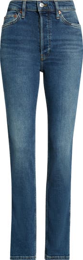 Designed in a skinny silhouette and topped with a soaring waist, these low-stretch jeans keep things classic in a dark, whiskered wash.