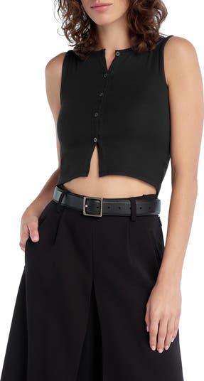 Allover ribbing lends a close fit to this cropped front-button top cut in a sleeveless silhouette.
