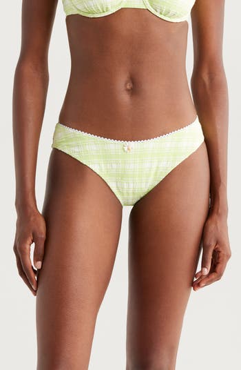 High-cut legs create a retro silhouette on these bikini bottoms fashioned with a contrast lace trim for a striking poolside look.