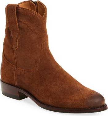 This versatile leather boot is a modern take on the classic western style and is cut with a shorter shaft so it comfortably fits under fitted jeans and pant legs. A discreet side zip, soft leather lining, three-quarter Goodyear welt construction and a durable leather sole provide long-lasting quality and easy wearing.