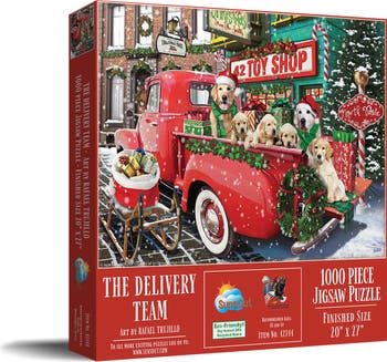 Experience the magic of the holidays with The Delivery Team 1000 pc Jigsaw Puzzle by SunsOut Puzzles, featuring artwork by Rafael Trujillo. Embrace the joy of creating a festive winter masterpiece with adorable dogs and vintage vehicles that invites warmth to your holiday gatherings. Known for their durable interlocking pieces, SunsOut Puzzles offer a seamless and satisfying puzzle experience. This eco-friendly puzzle, crafted from high-quality recycled cardboard and printed with soy-based inks, ensures a stress-free assembly process. Rest assured in the promise of quality; every puzzle is proudly made in the USA and comes with a worry-free guarantee. As an ideal present for adults who appreciate art and enjoy the challenge of a 1000 piece puzzle, The Delivery Team Jigsaw Puzzle will bring joy, accomplishment, and a sense of community to every puzzler. As a testament to SunsOut's commitment to supporting small businesses and highlighting exceptional artists, this puzzle is a celebration of the community, creativity, and the spirit of the season captured in Rafael Trujillo's captivating artwork.