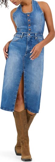 Racerback styling and a sassy front slit adds sultry style points to a denim dress turned to the perfect fade and eased with a touch of stretch.