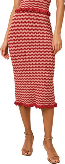 Contrasting trim creates dimension on this figure-skimming midi skirt made with a wavy striped texture and a frilled hem.