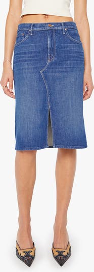 A front slit adds throwback style to this cotton nonstretch-denim midi skirt that is whiskered and washed to perfection.