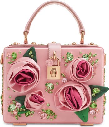 This structural box bag in petal-pink satin and calfskin blossoms with dimension thanks to playful embellishments of rosettes and colorful crystals.