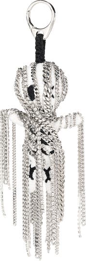 The label's emotional storytelling and macabre aesthetic combine with unexpectedly adorable results in this hand-crocheted bag charm of a skeleton doll wrapped in gleaming chains and strands of crystals.