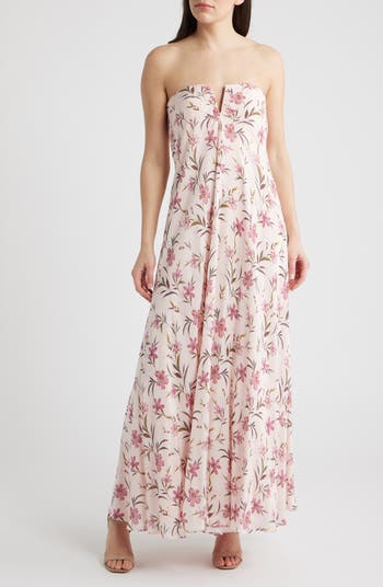 Pretty pink blooms gentle a strapless dress, notched at the neck and ready to charm the party circuit.