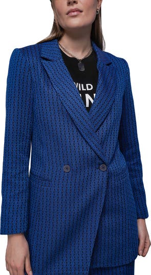 A double-breasted blazer in a textured woven jacquard with a long-line silhouette and smooth stretch lining.