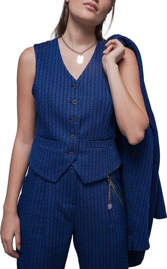 A tailored vest made in a textured woven jacquard with a button front and two functional front pockets.