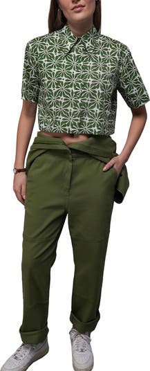 A cropped, breathable cotton button up shirt with an oversized boxy fit. Pairs perfectly with high waisted bottoms.