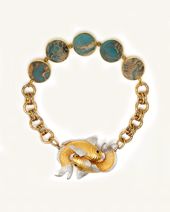 The Eternity Necklace pays homage to China, featuring a yin yang carp symbol and green jasper stone. Reversible design with a 19" length and 7 oz weight.