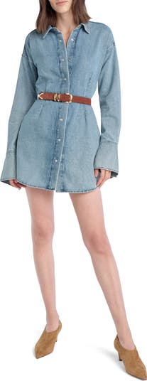 Seamed construction creates a cinched effect at the waist of this washed cotton denim shirtdress cut in a mini-length silhouette with dropped shoulders and exaggerated snap cuffs.