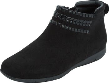 A modern update to the classic suede-like bootie with leather-like whipstitch detail and a comfortable, low heel.
