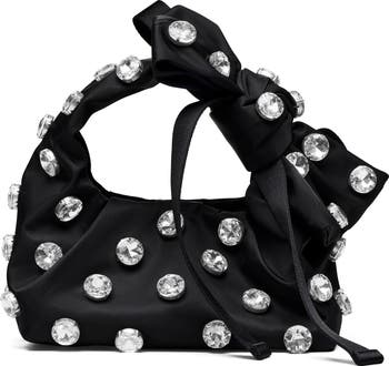 A knotted bow and lustrous embellishments elevate a slouchy nylon bag designed in a scaled-down profile featuring a removable zip pouch for convenient organization. An optional crossbody strap offers hands-free wear.