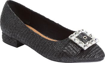 Meet your new favorite flat for effortless, all-season style. This pair gets dressed up with a pretty woven raffia upper and a bedazzled buckle.