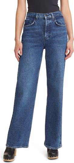 Enjoy a retro-chic, elongated look in these low-stretch jeans cut with a superhigh waist and full-length wide legs.