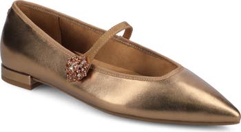 Our pointed-toe Mary Jane in premium Nappa leather with a metallic finish Vintage Gold, with a 15mm heel, and sleek rubber sole, comes with a rhinestone embellished button. The elastic attachment gives full adjustability, so you can slip in and out without unbuttoning every time. The sleek design includes a low-throat front topline, elevating the modern silhouette. The sock is lined with soft satin and comes with Birdies’ signature 7 layers of cloud like comfort. This timeless, versatile shoe is completed with our signature grosgrain back tab and gold Birdies logo. These Mary Janes pair great with all kinds of moments that have the habit of letting drinks turn into dinner. Who knows where these beauties will take you!