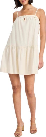 A flouncy frilled hem adds volume and movement to this sleeveless linen-blend dress cut in a leggy length and accented with a braided keyhole neck.