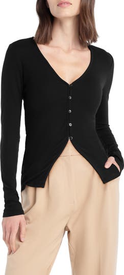 A cutaway detail adds a shot of sass to a button-up long-sleeve top offered in a ribbed-to-fit silhouette.
