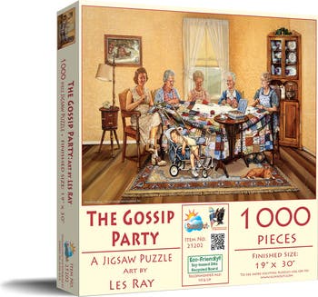 Immerse yourself in the enchanting world of "The Gossip Party," a 1000-piece jigsaw puzzle by SunsOut Puzzles, and relish the nostalgia of Americana through the engaging artwork by Les Ray. With interlocking pieces designed for a perfect fit, SunsOut's commitment to quality offers a seamless assembly. Crafted from high-quality recycled cardboard, this durable and eco-friendly puzzle is not only a joy to solve but also a journey into a story of shared moments. Manufactured proudly in the USA, SunsOut embodies high standards, ensuring missing or damaged pieces are quickly addressed, making your puzzle experience stress-free. Enjoy the peace of mind that comes with SunsOut's commitment to environmental responsibility, using sustainable soy-based inks and recycled materials, aligning with thoughtful consumer choices and supporting a proud woman-owned business. Measuring 19" x 30" upon completion, "The Gossip Party" makes an excellent gift for adult puzzle enthusiasts seeking a rewarding challenge and an opportunity to delve into a captivating narrative. Add it to your collection and spend countless hours entertained while also enthusiastically supporting eco-friendly practices. This beautifully crafted artwork, sure to become a cherished addition to your home, is wonderfully displayed in a large, full-color box, inviting you to dive into the puzzle experience.