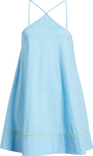Soothing shades color a sunny-day dress cut from stretch cotton poplin and designed to show off shoulders and collar bones.