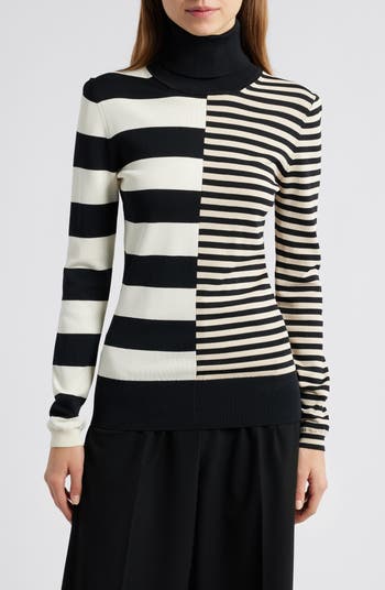 Variegated stripes embolden this soft and eye-catching turtleneck sweater.