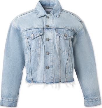 Born to be Wild. The Harvey returns this Spring in our new light indigo wash "She's All That". This casual raw hemmed denim jacket is rigid and cropped making it a staple for all your outfits. This jacket includes GRS certified recycled cotton reducing its carbon footprint and reducing water. Oversized by design — consider sizing down for a more subtle fit.