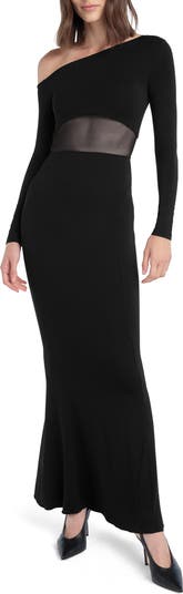A mesh panel at the midriff amplifies the modern allure of this stunning long-sleeve dress complete with an asymmetric neckline.