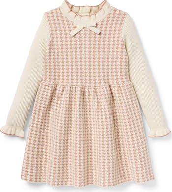Cozy and classic. Our soft sweater dress is finished with ruffle details and a bow at the neck.