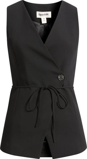 An asymmetric front closure creates a cutaway at the hem of this stretch-kissed woven vest tethered at the waist by a slender tie belt.