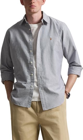 Breathable cotton oxford cloth washed in a pale solid makes an all-season favorite of a shirt that features a pony logo embroidered on the chest and a curved hem that works tucked or untucked. The buttoned collar and traditional tailoring keep you looking smart even when you don't have to.