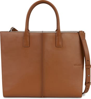 This tructured tote boasts a clean and crisp silhouette with a shoulder strap and handles for versatile carrying options.