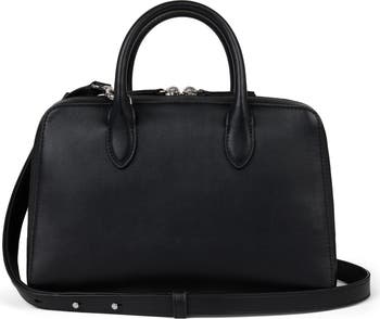 Clean lines and a structured silhouette distinguish a scaled-down leather satchel featuring divided compartments and an optional crossbody strap for on-the-go convenience.