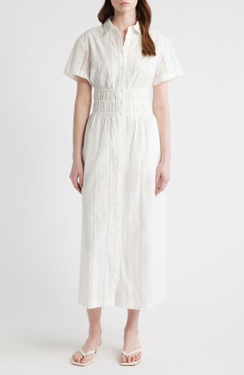 Delicate eyelet embroidery and scalloped lace insets bring charming texture to this midi shirtdress finished with a button-front placket and an elasticized waist that defines the silhouette.