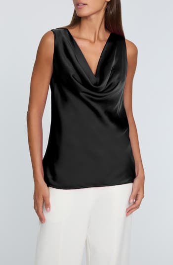 Bring timeless sophistication to any look with this satin tank designed with a drapey cowl neckline.