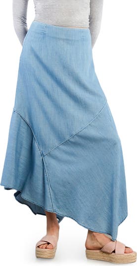 Bias-cut panels enhance the shape and movement of this flowy maxi skirt cut from light-wash denim.
