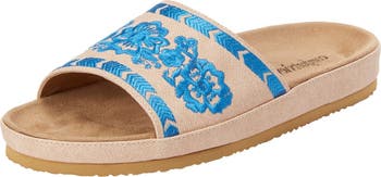 A classic and comfortable flat sandal with floral embroidery for feminine flair.