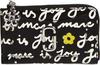 Bring a little whimsy to your everyday carry with this textural Saffiano leather wallet patterned with "Marc is joy" and finished with a dimensional daisy zipper pull for signature charm.